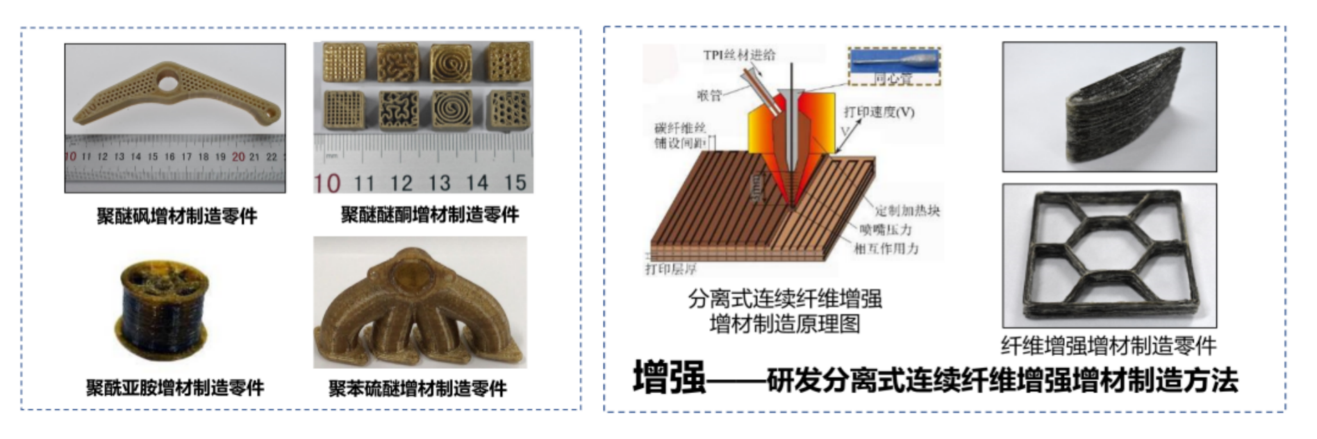 研發(fā)了高性能難成形特種工程塑料的增材制造方法與設(shè)備,揭示了高性能特種工程塑料增材制造的成形機(jī)理,實(shí)現(xiàn)了多種高性能特種工程塑料的增材制造,提出纖維/碳納米管增強(qiáng)高性能特種工程塑料增材制造策略,實(shí)現(xiàn)高性能特種工程塑料增強(qiáng)改性增材制造,為其在汽車、航空航天醫(yī)療等領(lǐng)域的廣泛深入應(yīng)用提供了新的技術(shù)支持。