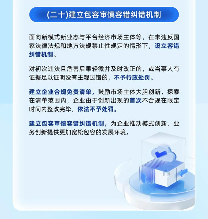 第六,建立包容審慎容錯糾錯機制,對初次違法且危害后果輕微并及時改正的,或當事人有證據足以證明沒有主觀過錯的,不予行政處罰;企業由于創新出現的首次不合規在限定時間內整改完畢,依法不予處罰。