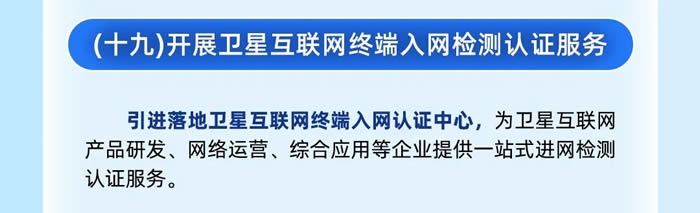 第五,開展衛星互聯網終端入網檢測認證服務,為衛星互聯網產品研發、網絡運營、綜合應用等企業提供一站式進網檢測認證服務。