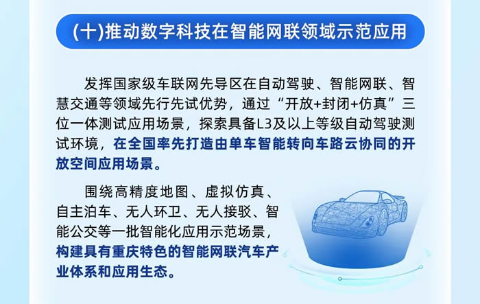 智能網聯領域在全國率先打造由單車智能轉向車路云協同的開放空間應用場景,構建具有重慶特色的智能網聯汽車產業體系和應用生態。