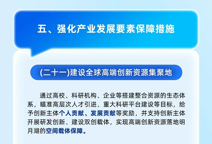 將著力引進一批總部類機構、重點孵化培育一批新技術市場主體、支持發展一批主導產業融合創新類企業,構建覆蓋企業成長全過程的明月湖基金體系,給予創新主體貸款貼息支持、投資融資支持,對符合條件的企業給予上市獎勵等。