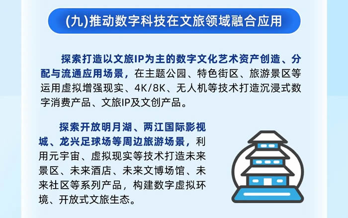 文旅領域探索打造以文旅IP為主的數字文化藝術資產創造、分配與流通應用場景,探索開放明月湖、兩江國際影視城、龍興足球場等周邊旅游場景。