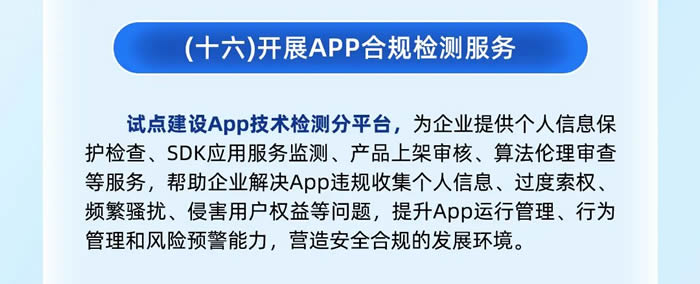 第二,開展APP合規檢測服務,為企業提供個人信息保護檢查、SDK應用服務監測、產品上架審核、算法倫理審查等服務。