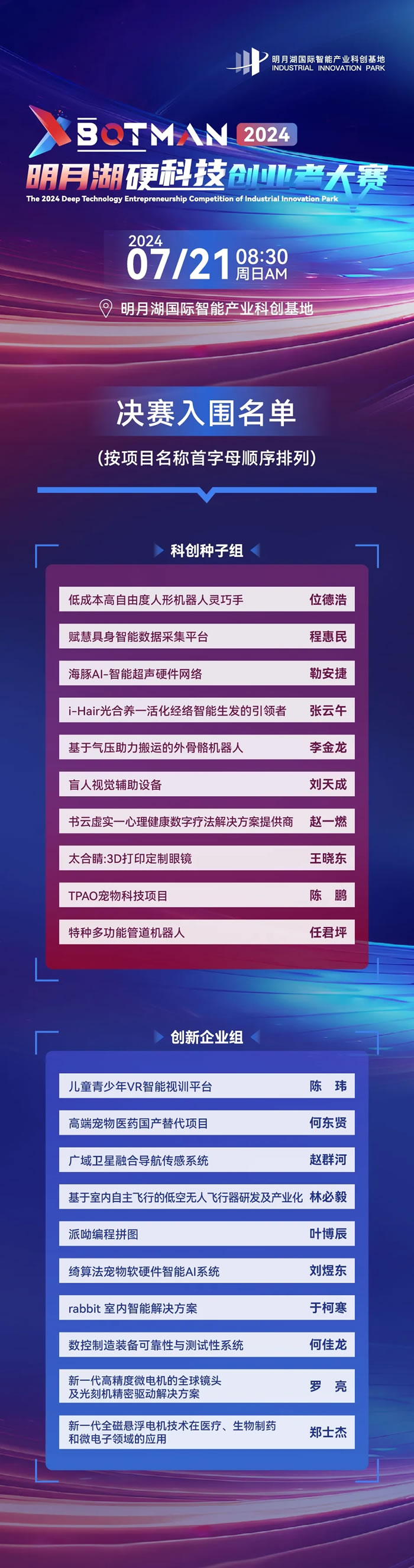 經過資格審查、線上初賽路演等環節的綜合評定,最終評選出科創種子組10個項目、創新企業組10個項目進入XbotMan—2024明月湖硬科技創業者大賽決賽。